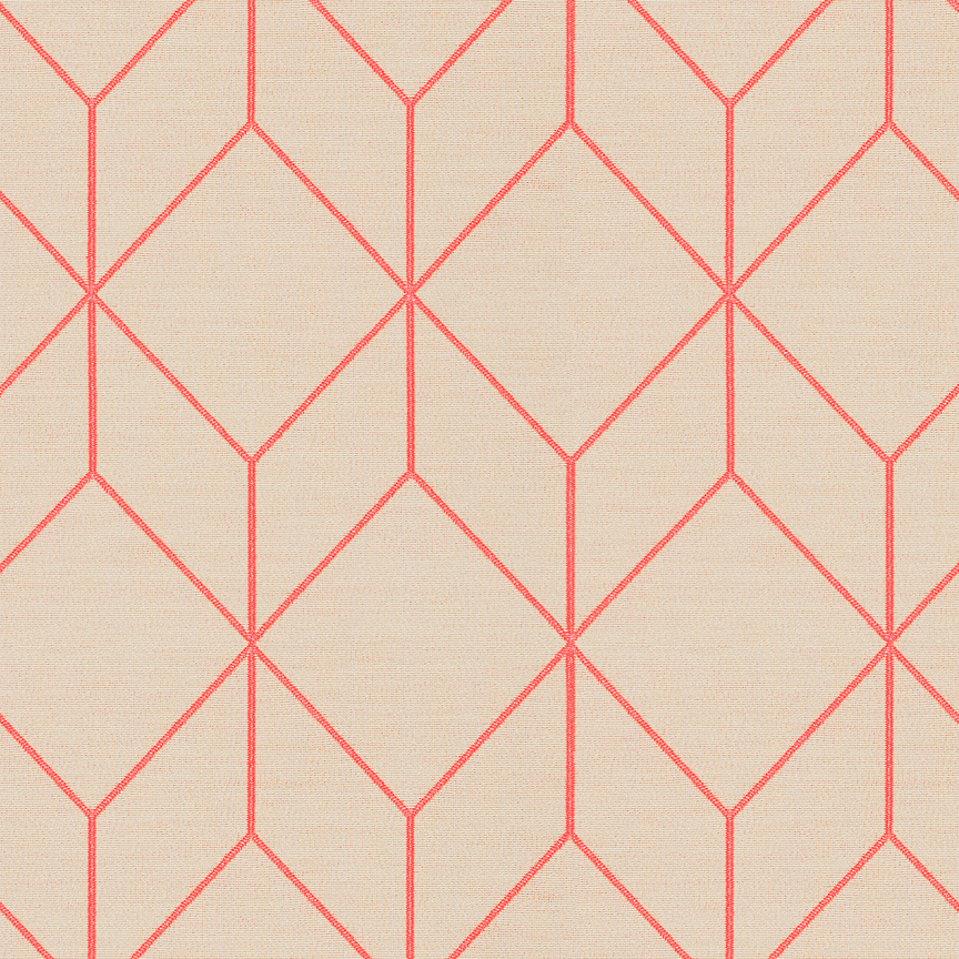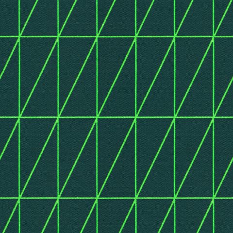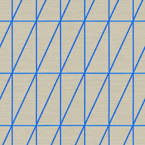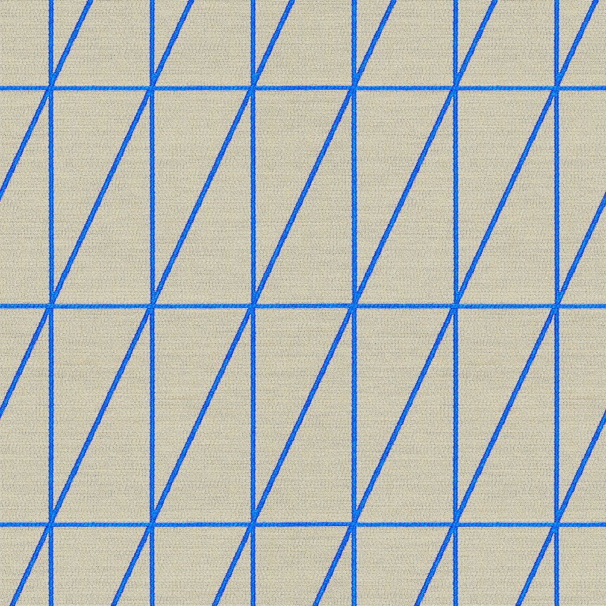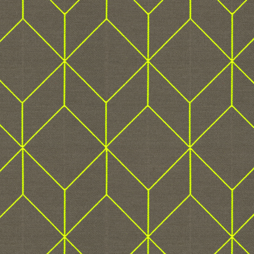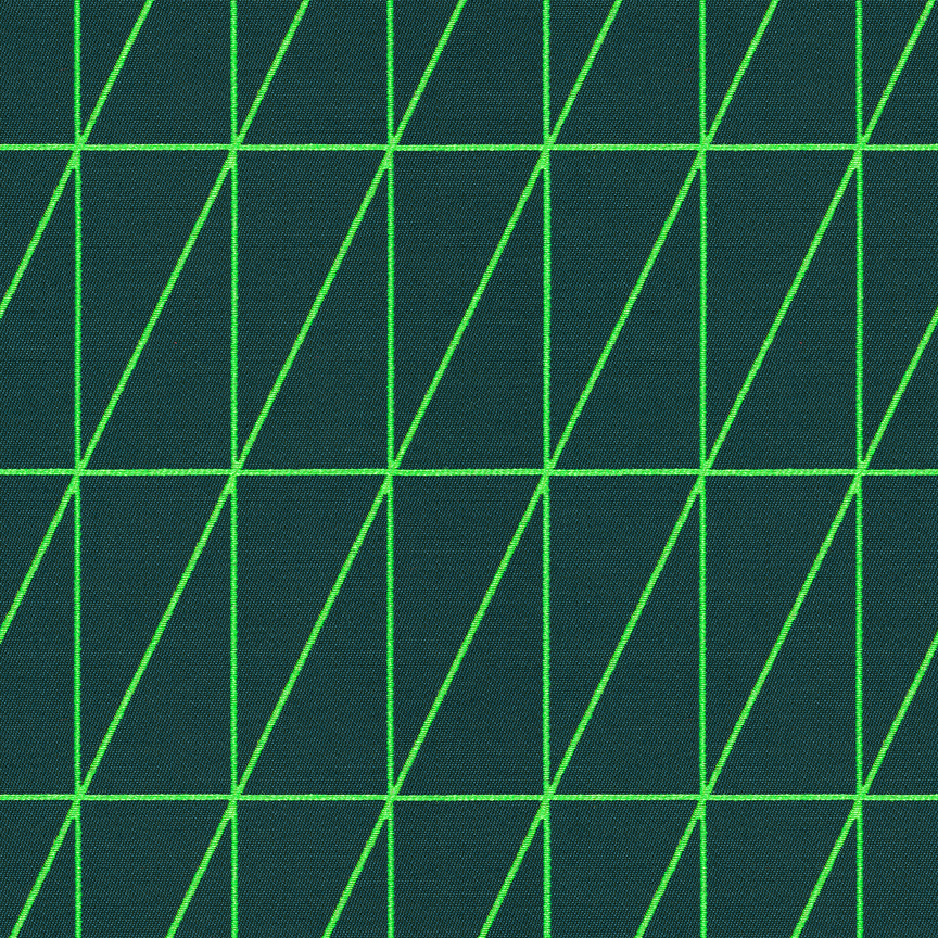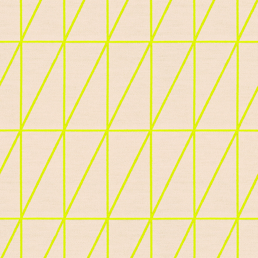 As with Blocks and Grid (2014), the essence of the Bright grouping lies in the inherent possibilities for combination and variation. With a unified palette of five colours apiece, the three textiles are designed to be used in tandem and to form new geometric relationships when combined. The patterns progress from a basic grid to a more complex formation: Bright Grid offers rigorous simplicity, Bright Angle cascades in an endless rhythm of obliquely bisected rectangles, and Bright Cube achieves layered depth through optical perspective. Rendered in a fluorescent spectrum of specially dyed nylon yarns developed with the Maharam Design Studio’s oversight, the patterns effectively map the three-dimensional forms to which they’re applied. The subtle textural contrast of lustrous nylon yarns against a matte cotton ground further enhances the sharp geometry and clear colour story.