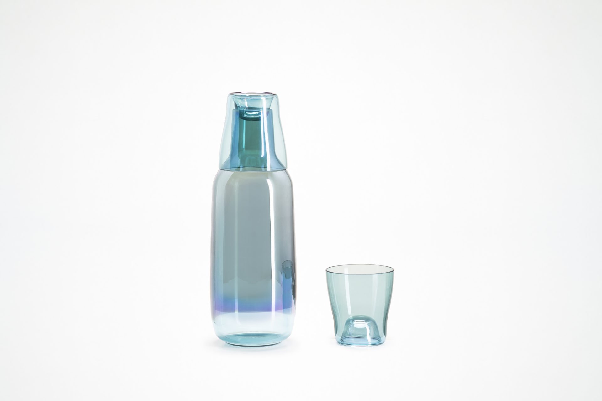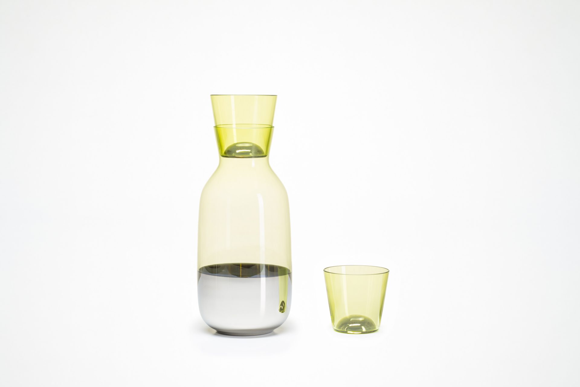 Three different collections of hand-blown coloured glass with metallic coating, consisting of two decanters with matching glasses and a series of five table pieces designed for Verreum.