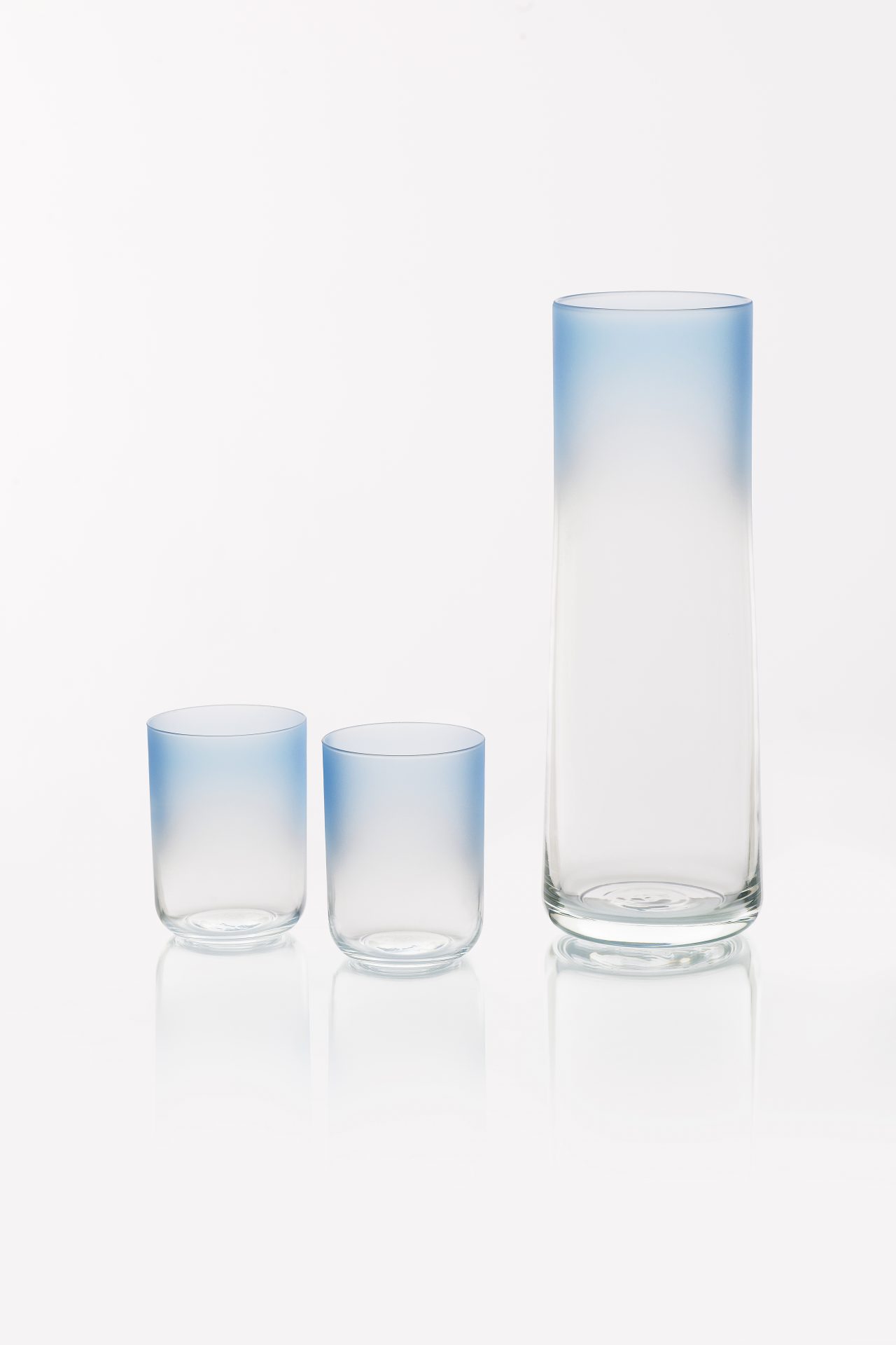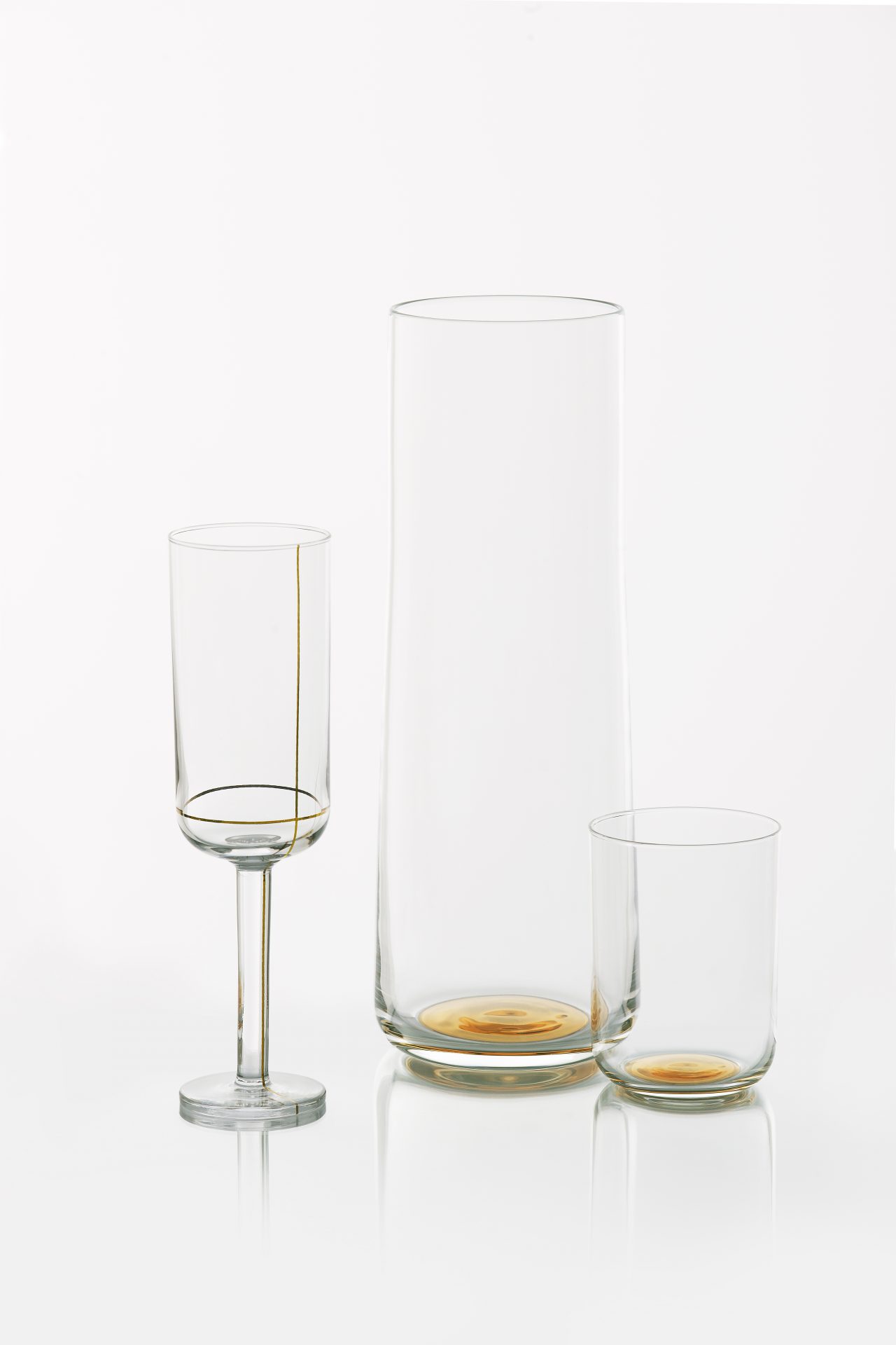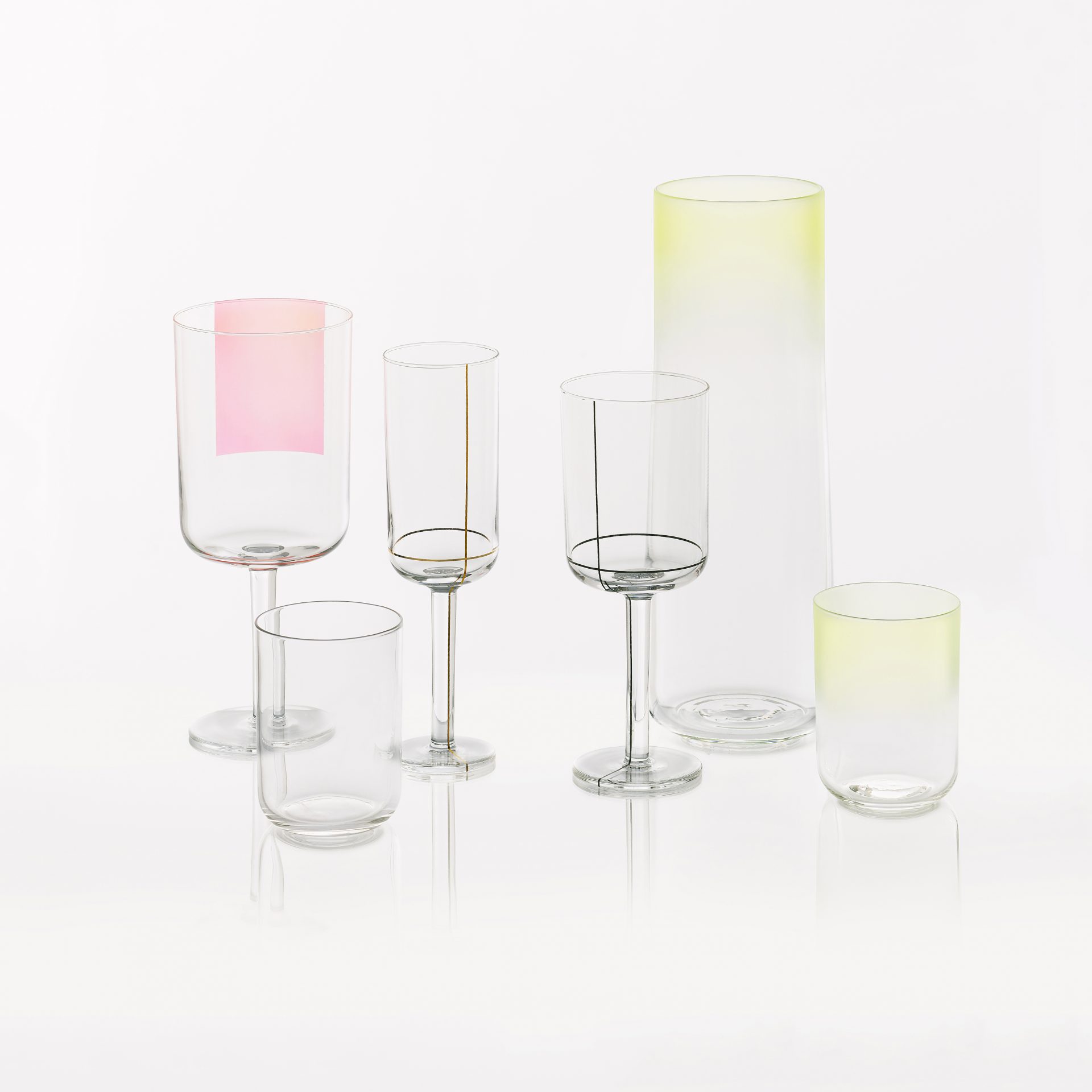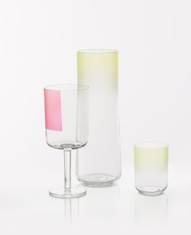 The first models are made by hand in thin, transparent plastic and taped to each other. These tape seams are translated on the wine glasses into black and gold lines. Colour compositions are created on the glassware by means of circles and planes: gold dots on the bottom of the water glass and carafe, and a bright pink rectangle on the red wine glass, the latter referring to the colour of the red wine. The specific finishes add visual detail to the glassware and bring colour to the table. The gold dots seem to drift in the water and the lines merge with the liquid. The yellow and blue colour gradients appear to be floating above the table, giving it an extra dimension.