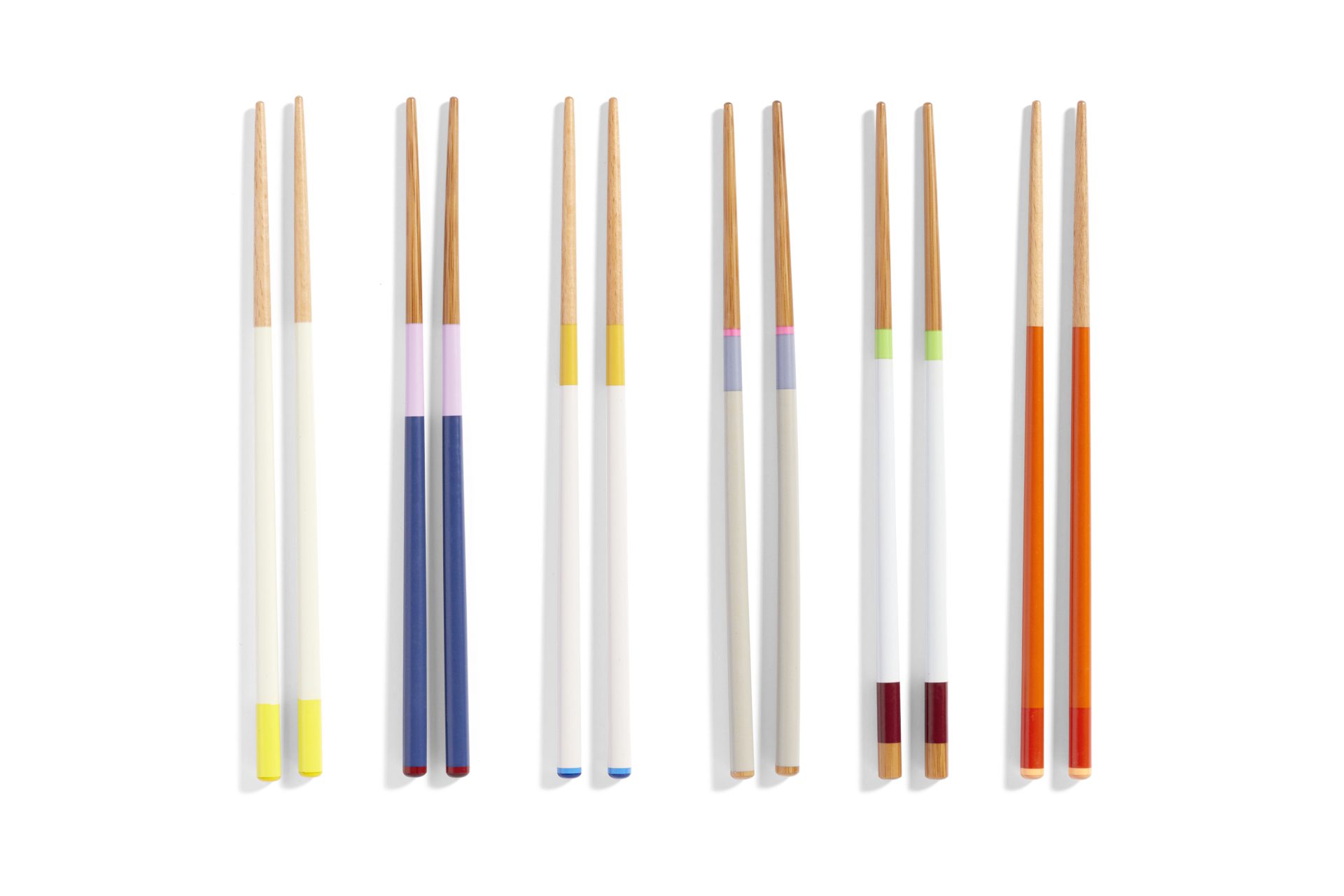 Colour Sticks are a modern take on traditional Asian chopsticks. Featuring a colour-blocked design in bamboo and beech, the chopsticks come in a pack with six different designs.