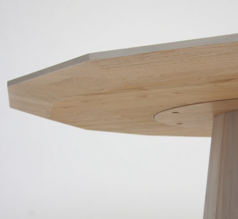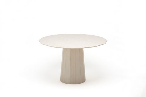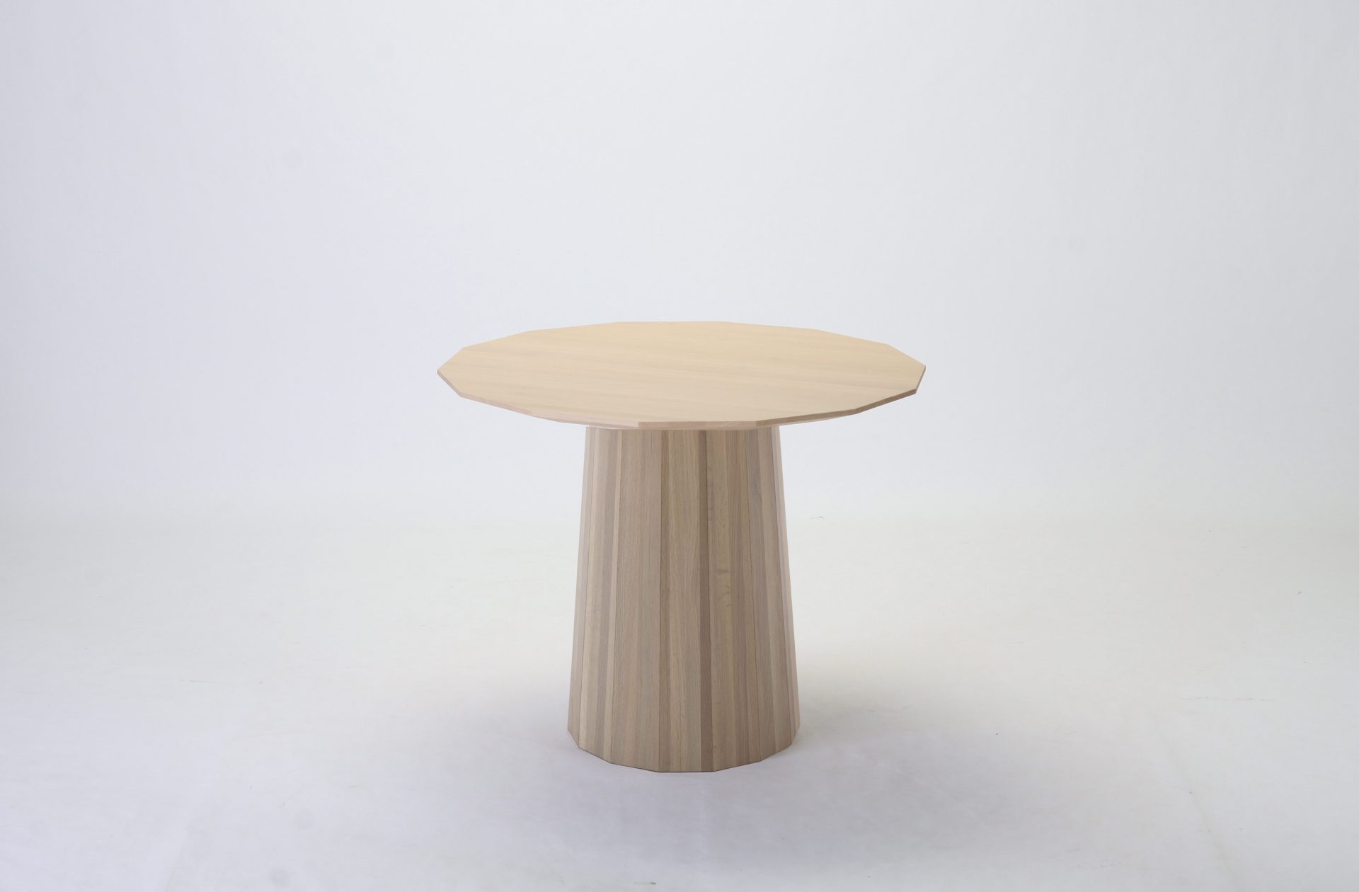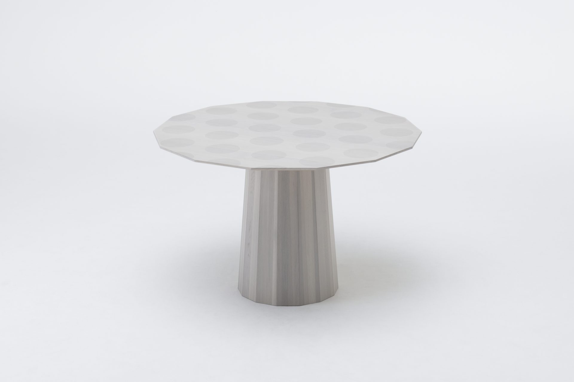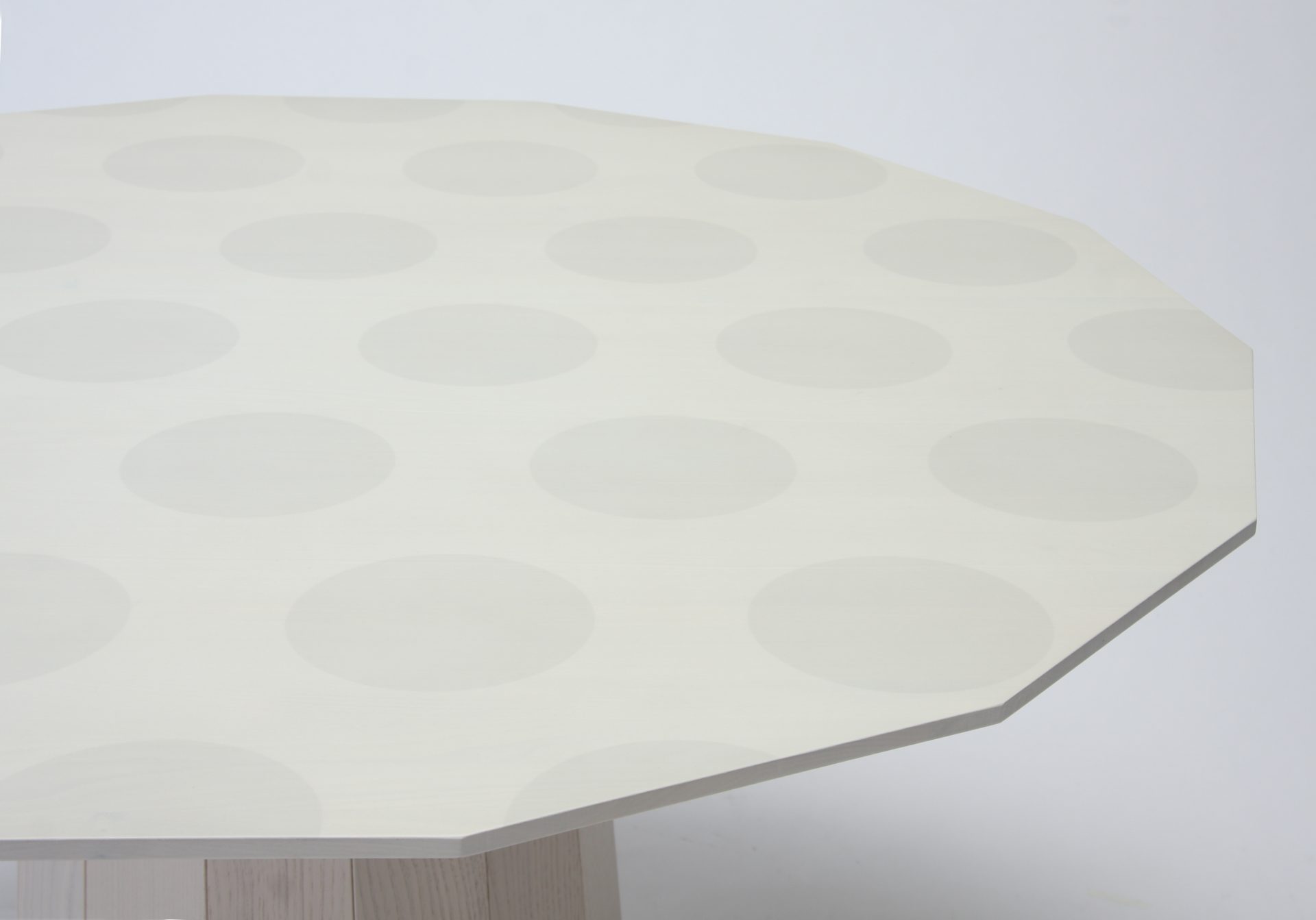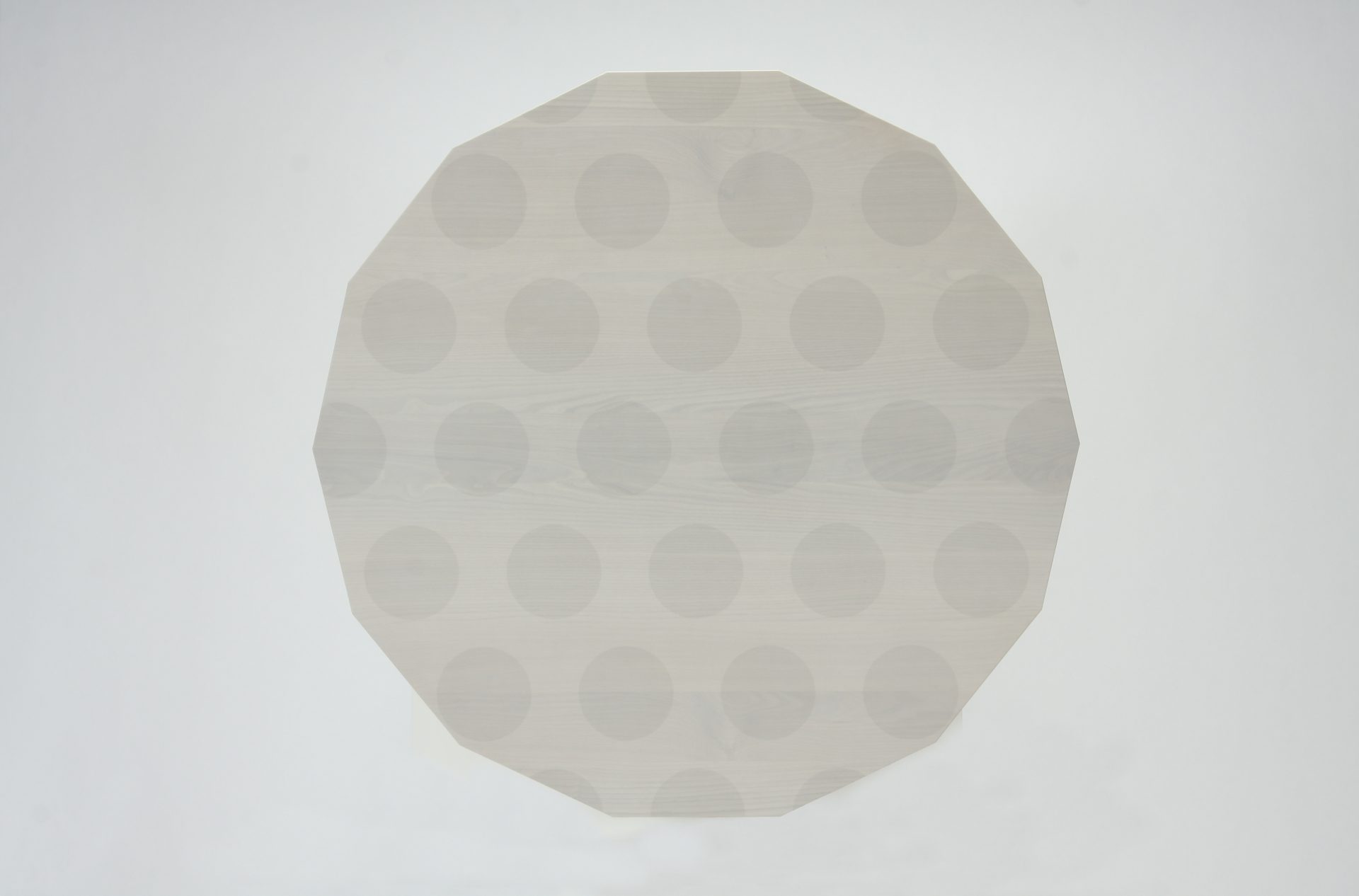 The 14-sided dining table with its characteristic, barrel-shaped base is printed with a transparent pattern, using a cutting-edge technique and representing contemporary design being superimposed on traditional craft techniques. The design of the pattern, which is characteristic of Scholten & Baijings, interacts with the texture of the wood and takes on the appearance of a transparent tablecloth. The table comes in two sizes, seating 2~4 and 4~6 people respectively and can be easily dismounted for transportation.