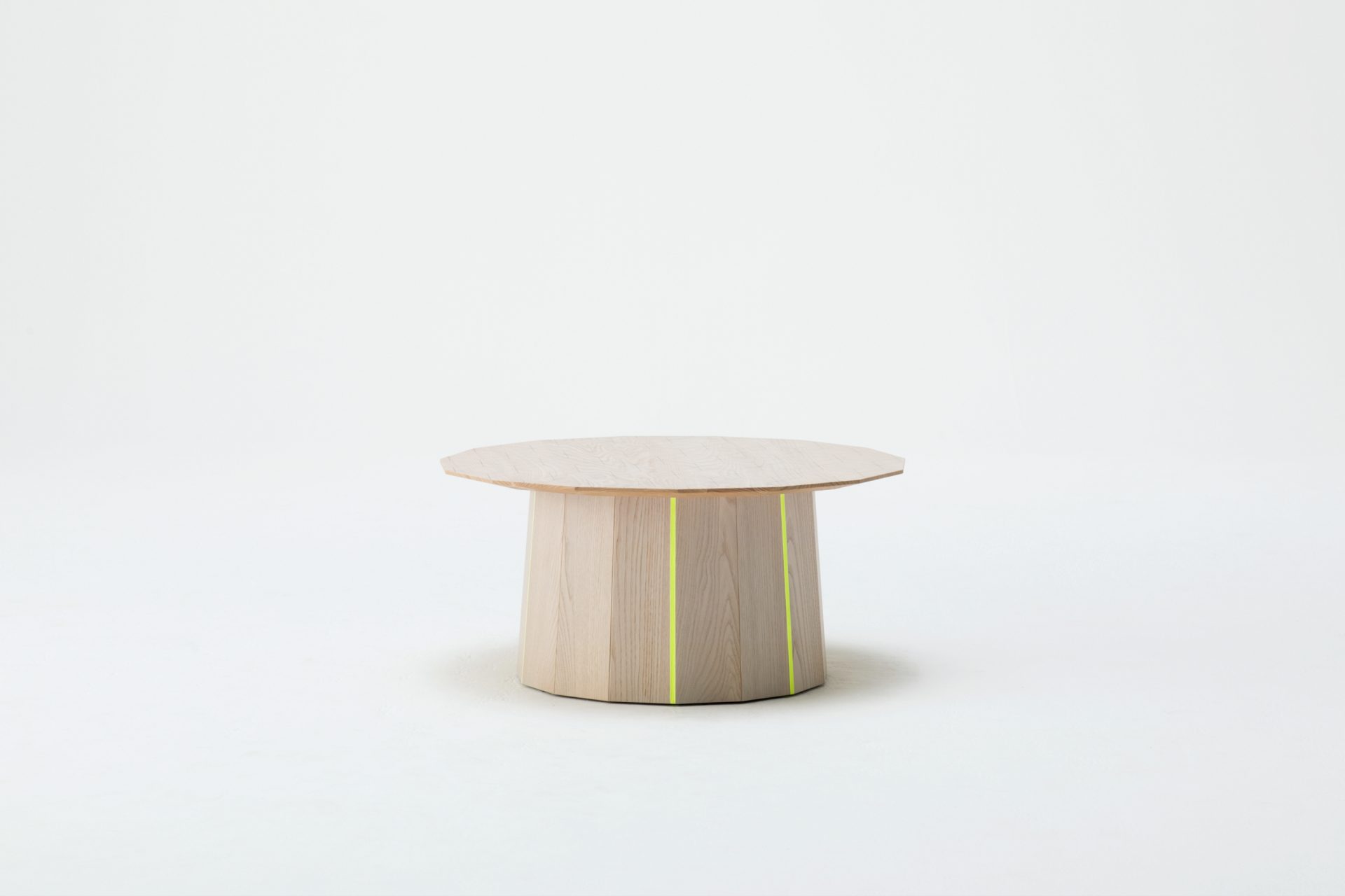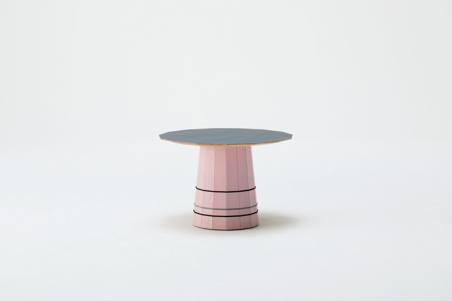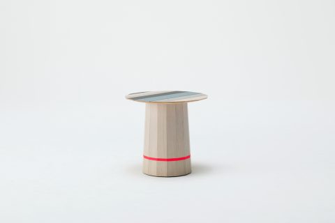The side tables vary in size, colour and pattern. The objects are the result of considerations based on the characteristics of thinned wood as well as woodworking traditions. Small diameter wood is joined to form a volume. The symbolic layers of a contemporary view on traditional shapes and techniques are achieved by superimposing different layers of colour shades and patterns. The texture of the wood is overlayed with translucent colour, which in turn is overlayed with a printed graphic pattern. The layers balance each other out and create depth in the stained and printed oak.