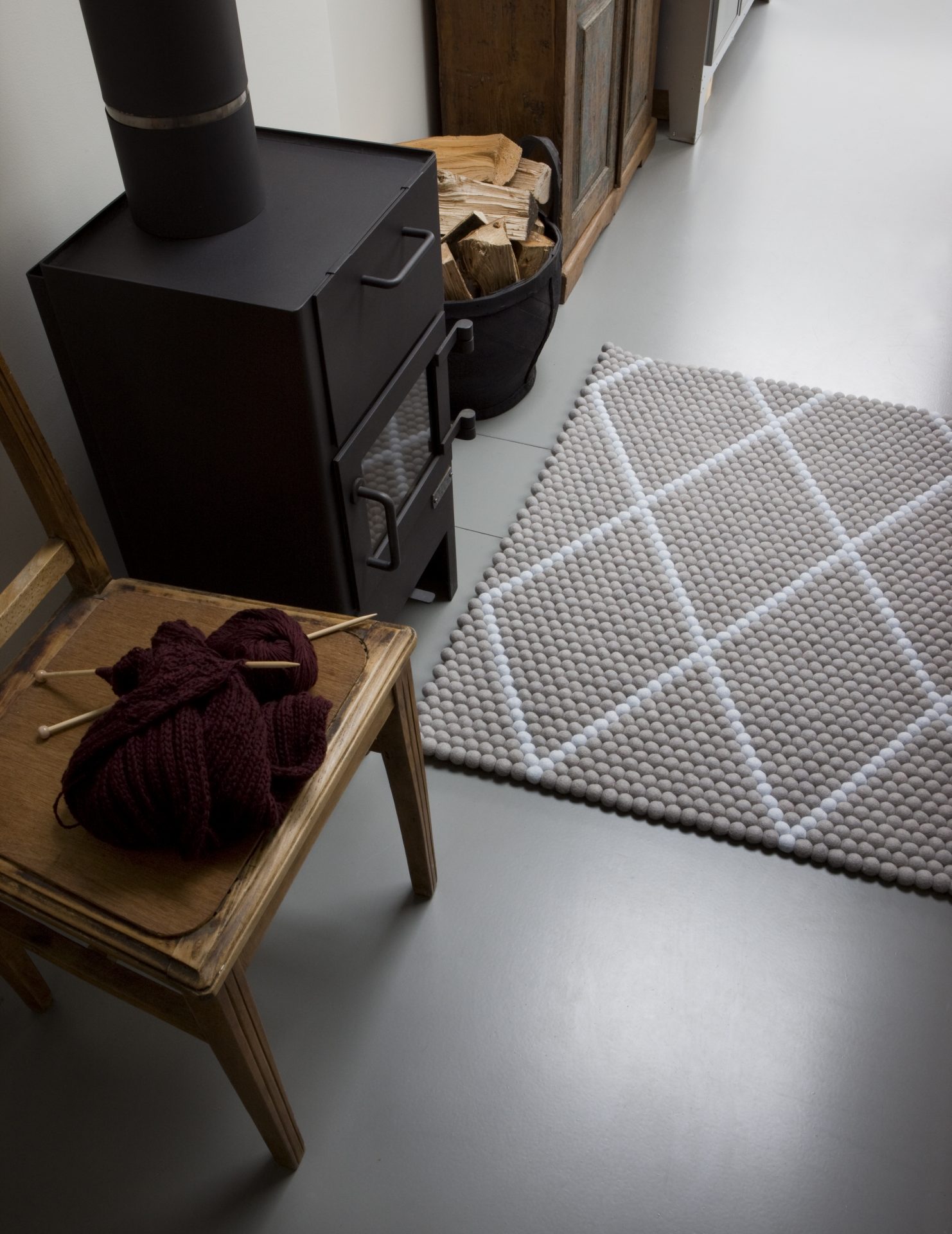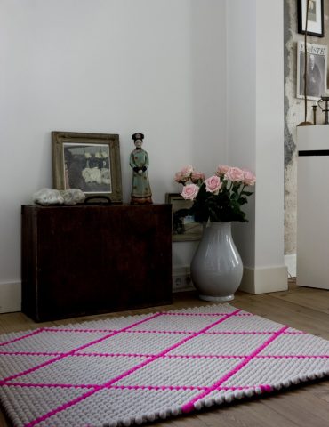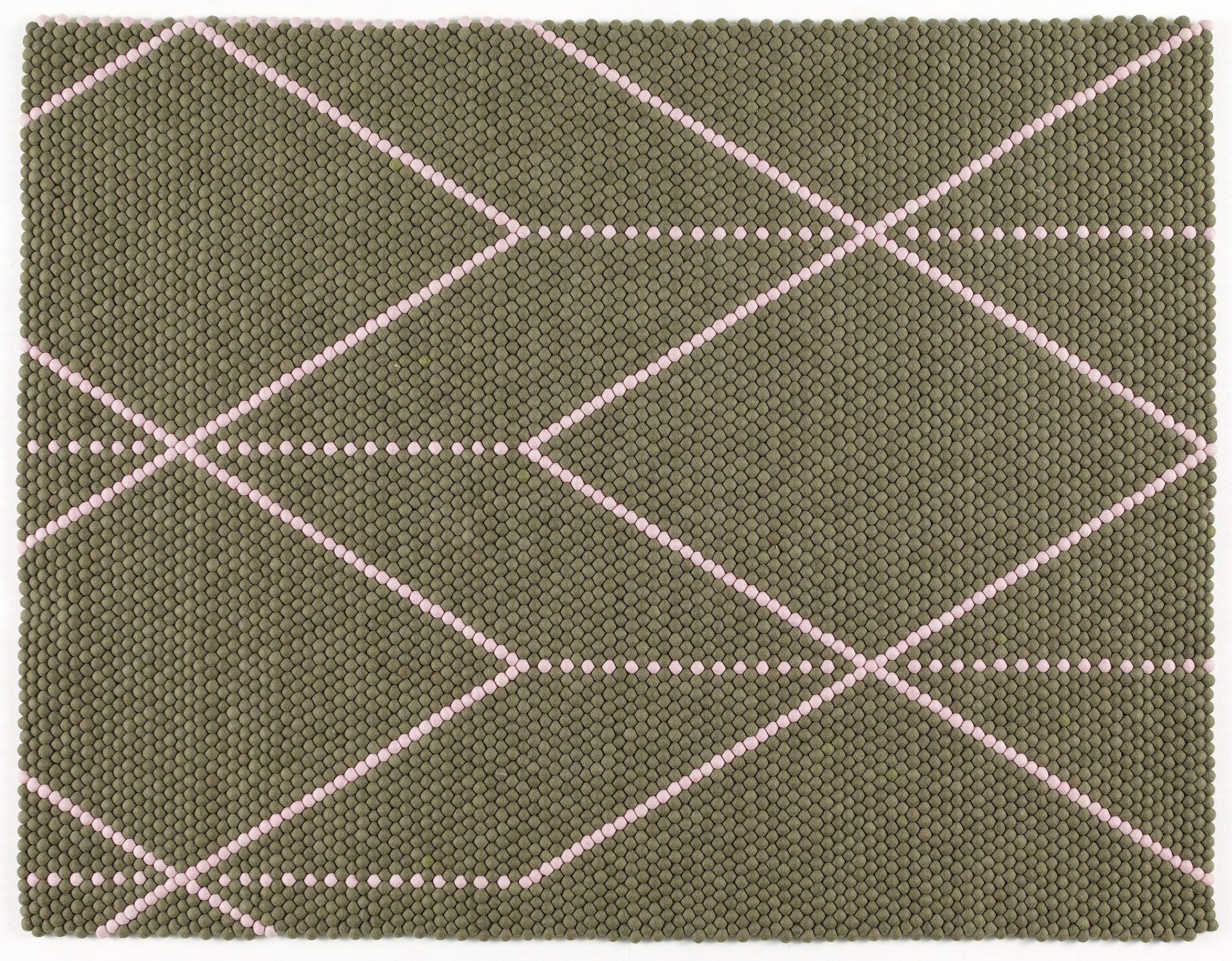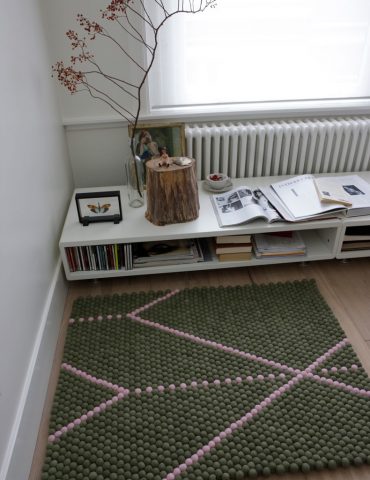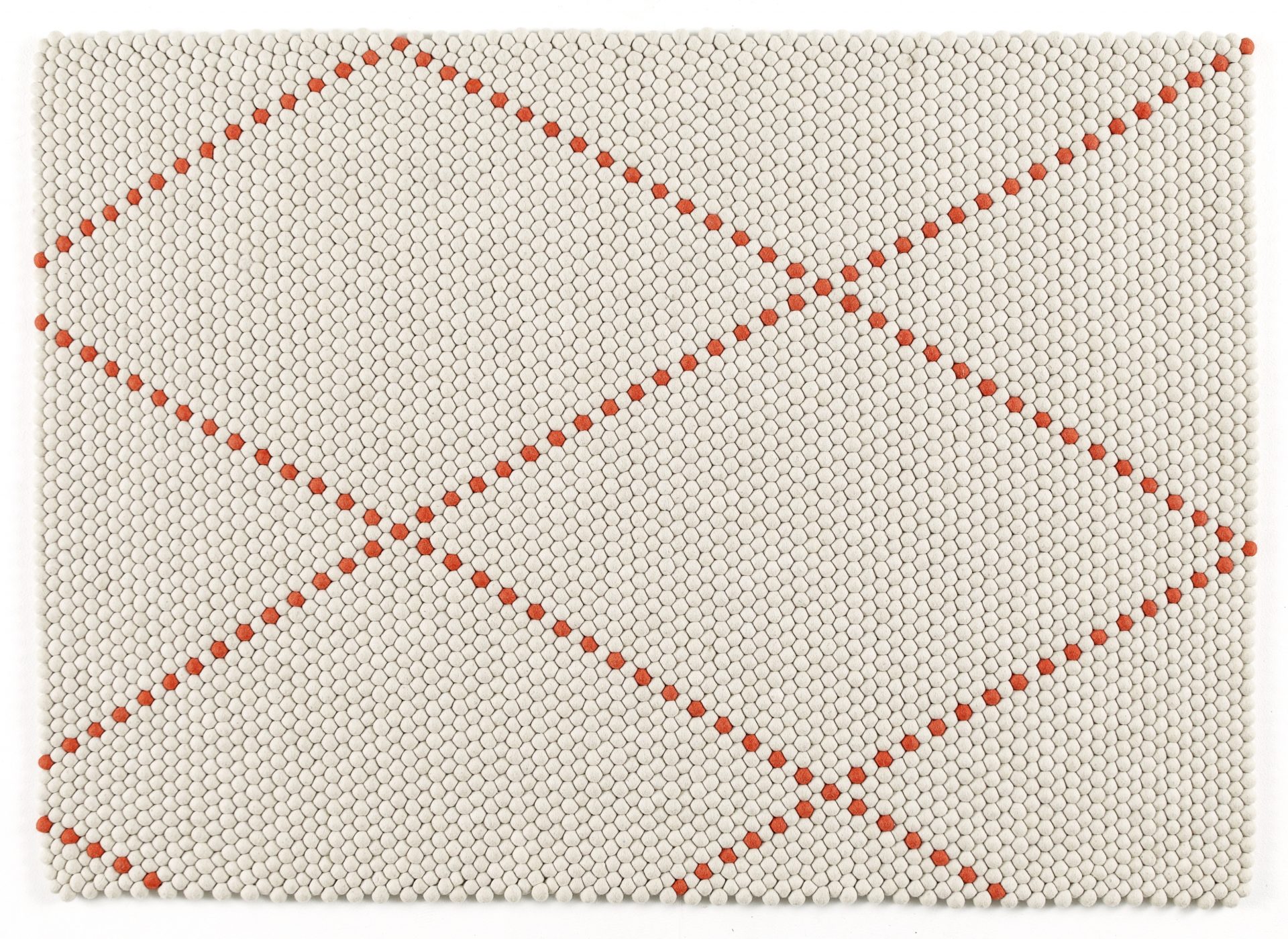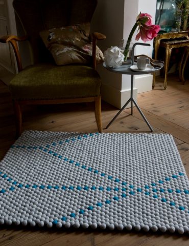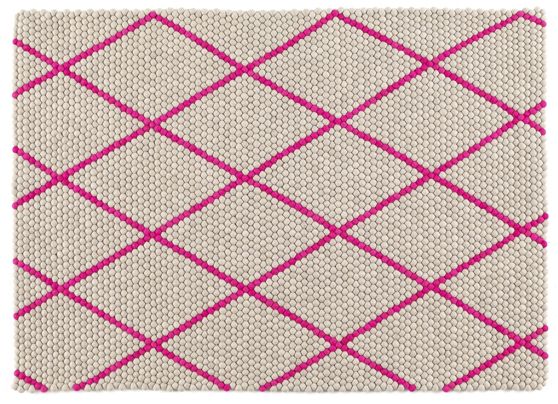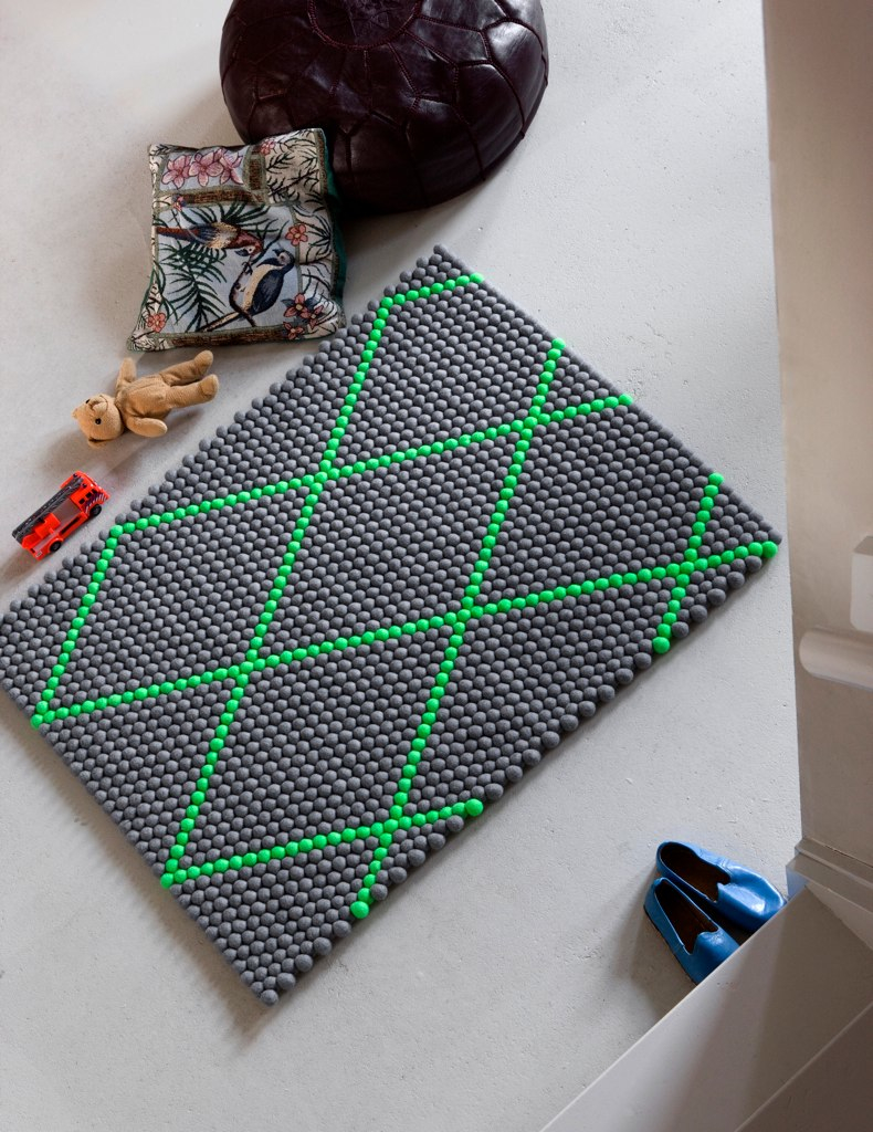 These Dot Carpets just consist of balls and have over thousands of balls in one carpet. They are made of felt, 100% wool. These felt woolen balls are stitched together by hand. Each carpet is named after its grid colour. So original names derive as: Hot Pink, Electric Green, Glacier Silt and Poppy Red.