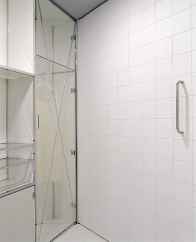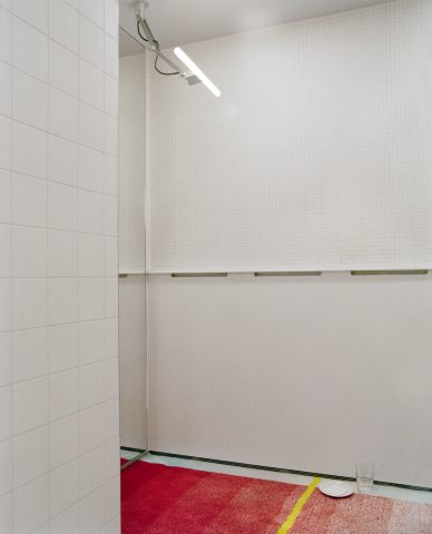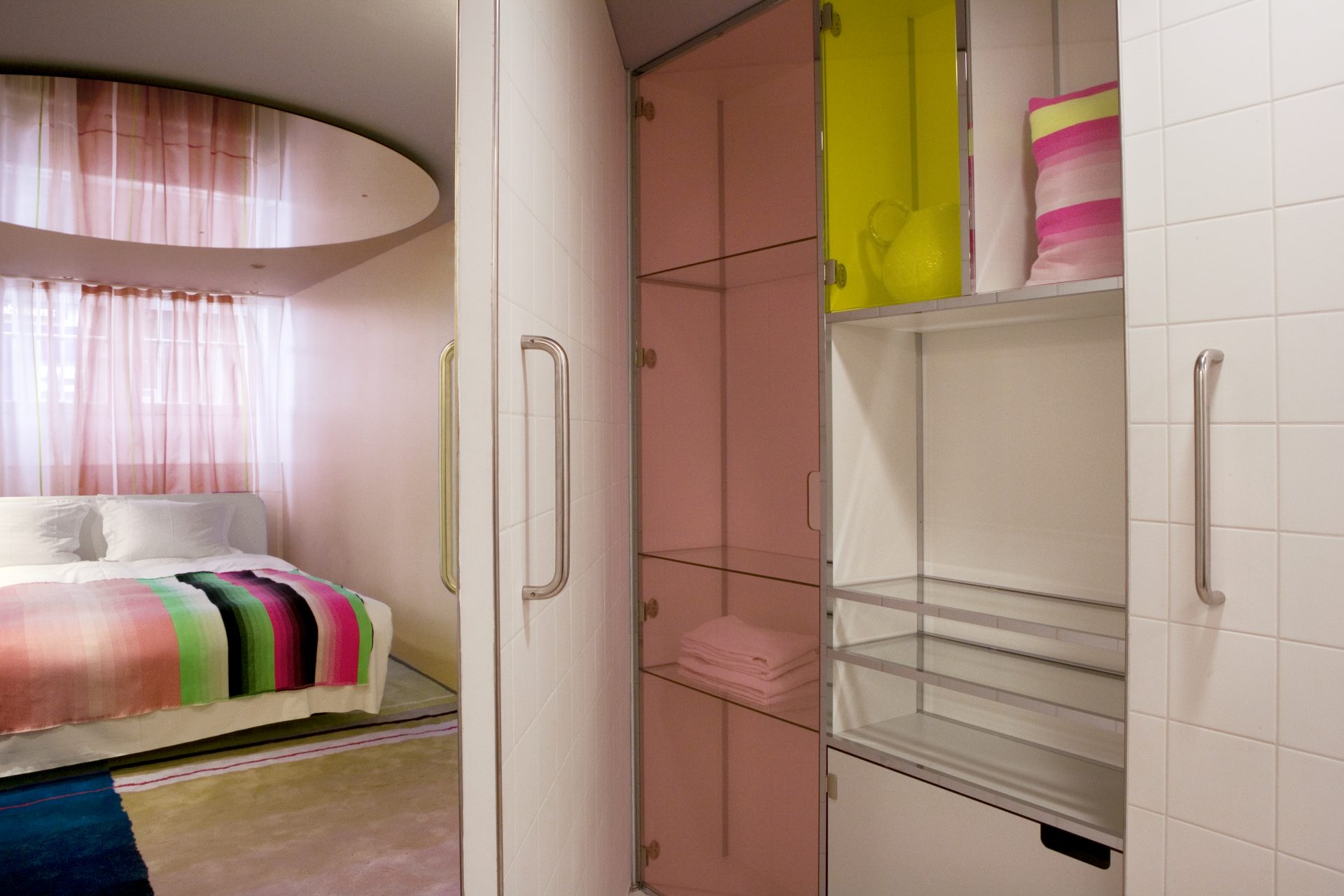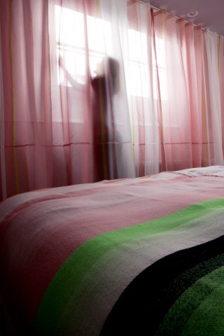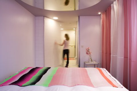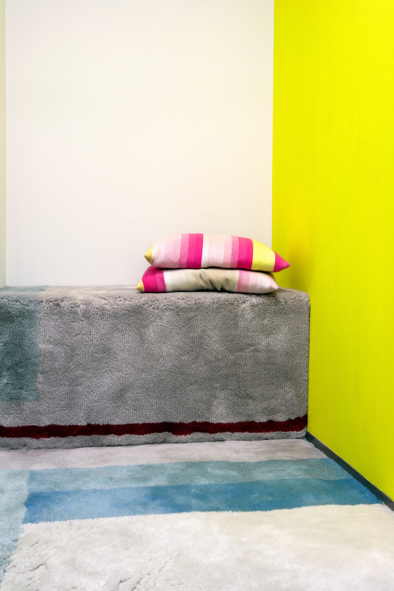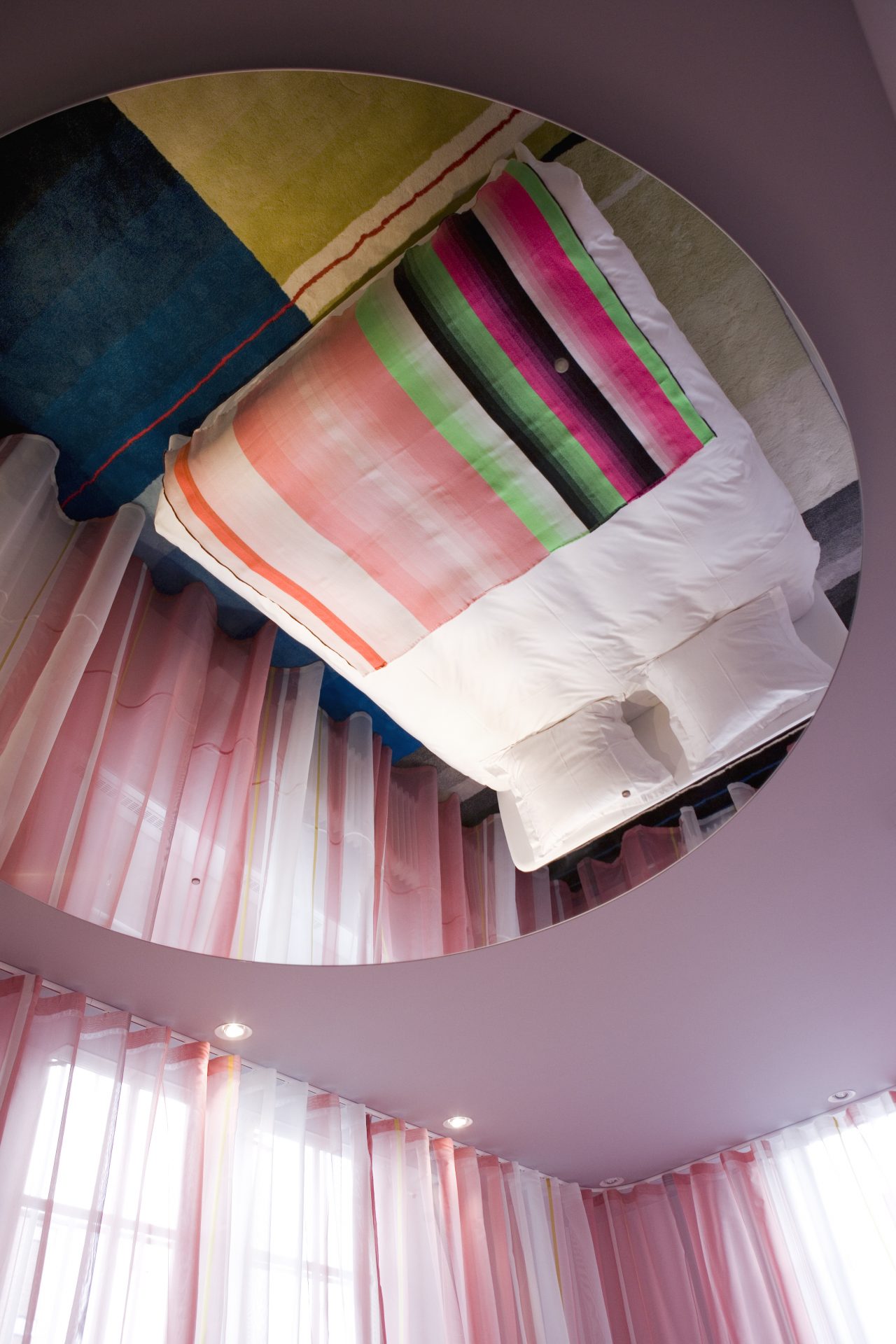 Scholten & Baijings designed a traditional style room where everything revolves around layering, colour and transparency. There is only a bed; all other furniture has been removed. One is surrounded by colour. The most striking eye-catcher is the carpet, which has been tufted in harmony with the shades of the Colour Plaids. The carpet has a luxurious, deep-pile texture that invites one to sit down on the floor and enjoy a moment of calm and relaxation. The curtains, specially woven at the Textile Museum, come in a graduated colour scheme. There is a large mirror on the ceiling in which the entire room is reflected. This creates a strangely fascinating effect.