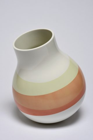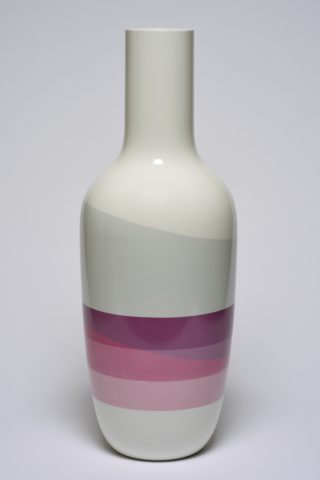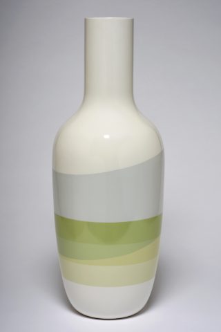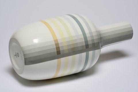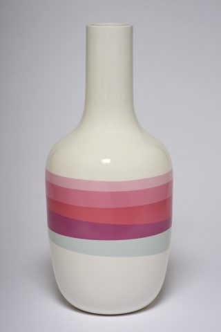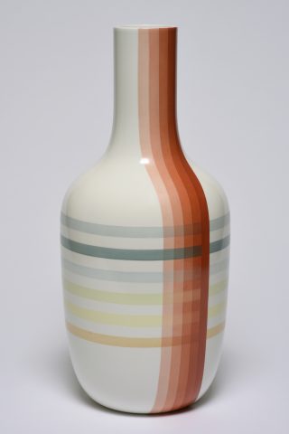 The result of this fruitful collaboration is a perfect symbiosis of shape and colour. A chromatic world all their own, perfectly recognizable, with diluted pastels of an almost fluorescent intensity complemented by the excellence and expertise of Sèvres, where shapes and colours are tailor-made for our guest artists. For their project, Scholten & Baijings reinterpreted various forms of vases from the Manufacture’s repertoire, and became fascinated by the palettes of enamels on offer. The two series of porcelain vases and the series of porcelain tondi thus created present new astonishing colours, with superposed and juxtaposed enamels producing a jubilatory effect.