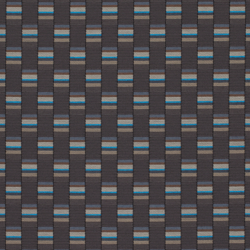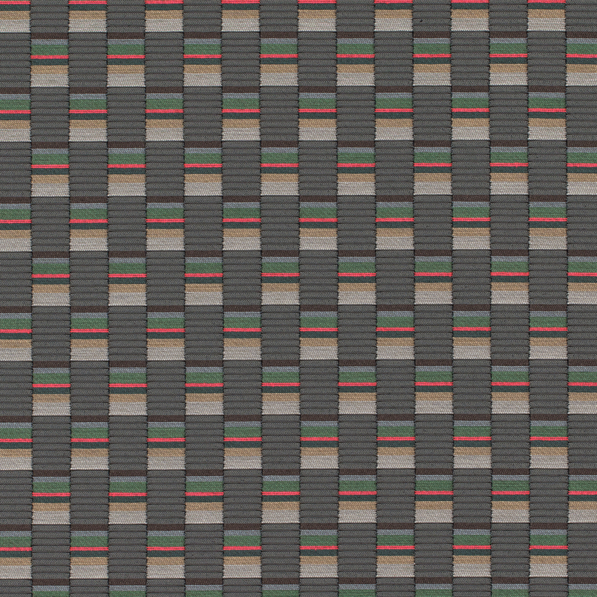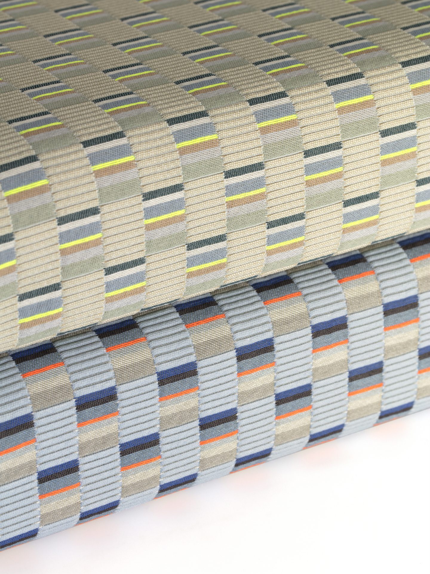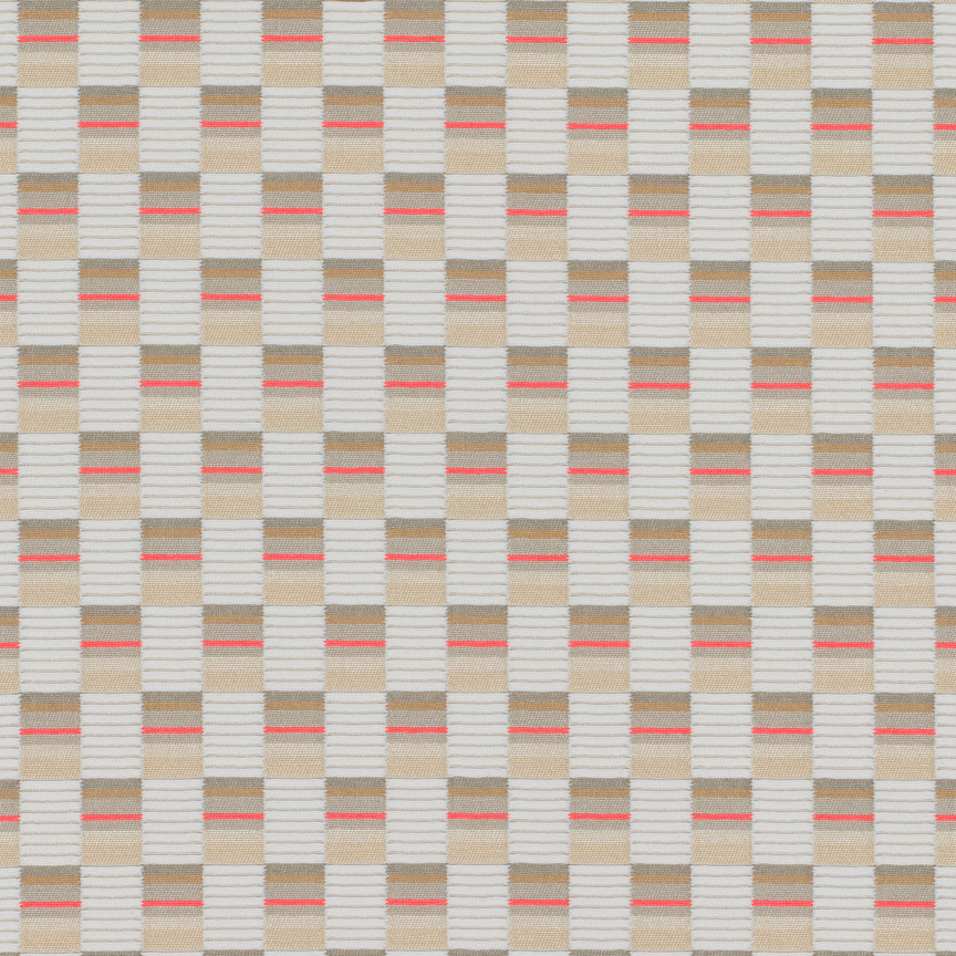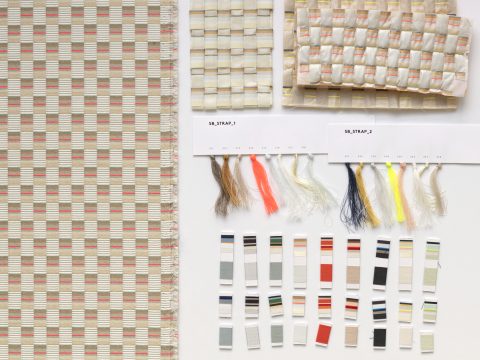 The concept for Mesh derives from Scholten & Baijings’s Strap Chair (2014), which reinterprets 17th-century Dutch cane or woven chairs. Specially developed braided polyester straps are wound around the chair’s tubular frame in a striped, light-to-dark arrangement, producing harmonious combinations of hues. Likewise, Mesh’s animated surface features a modified checkerboard pattern wherein rectangles of ribbed texture alternate with smooth stacks of compact colour punctuated by crisp fluorescent stripes. These critical colour accents are evident in the earliest prototypes, in which a checked pattern was anchored to a foam backing by vivid stitches. In addition to these samples, Scholten & Baijings’s studio produced yarn windings as studies for the juxtaposition of solid and composed colour.