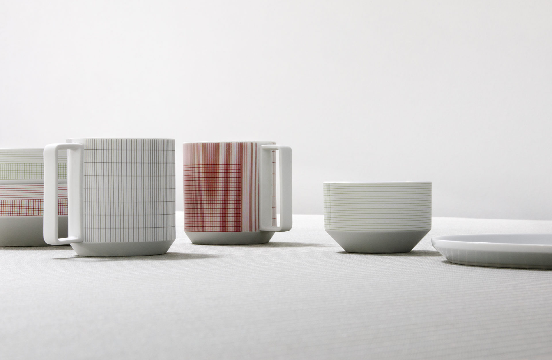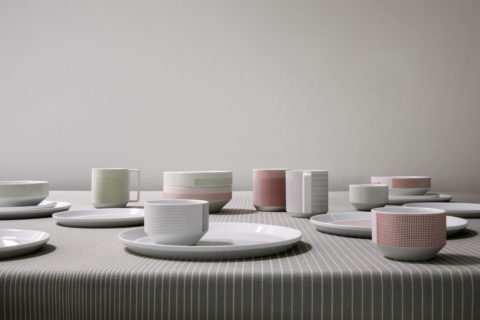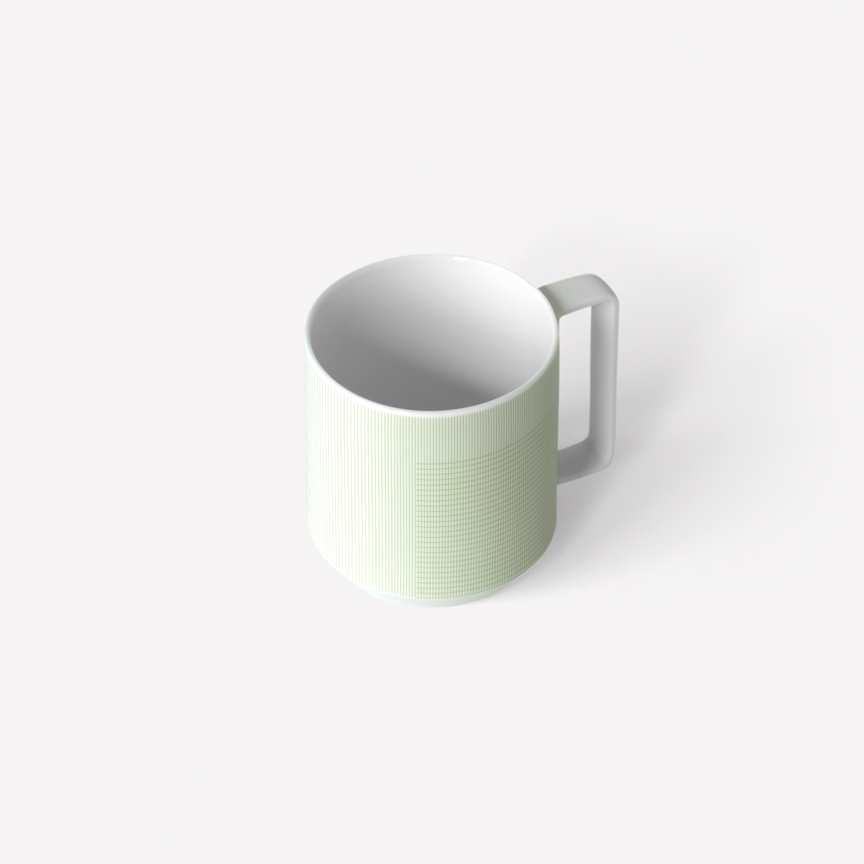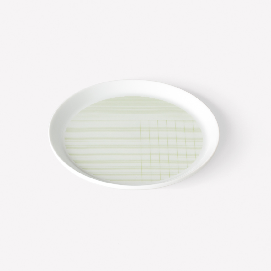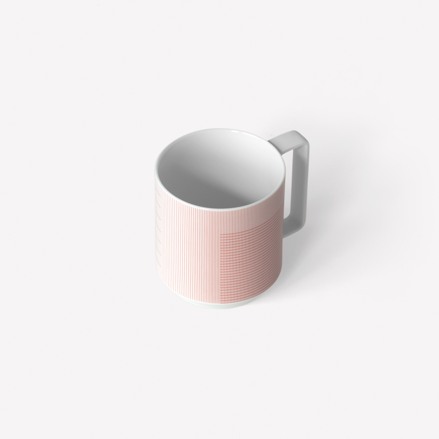 Geometric simplicity characterizes the five-piece set of porcelain tableware—encompassing a small and large plate, bowl, cup, and mug—seen in circular volumes set atop slightly conical bases. Produced by 1616 / arita japan, the porcelain is embellished with a graphic reinterpretation of Grid, a groundbreaking textile created by Scholten & Baijings in 2014 in collaboration with the New York-based Maharam Design Studio. Over the course of the textile’s unusually long repeat—based on the ten yards typically required to upholster a sofa—Grid investigates color densities built up by parallel and perpendicular lines. In Stefan Scholten’s words, “The density of the grid determines how one experiences color and gives the color a more airy appearance than a monochromatic color plane.” Now at a dramatically reduced scale and with inverted color proportions, Grid enlivens the porcelain pieces in three different color schemes applied with varying matte or gloss effects.