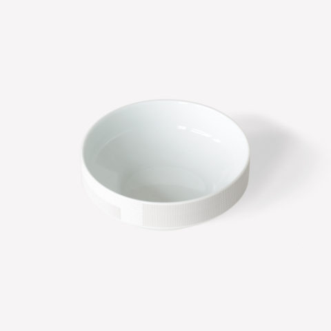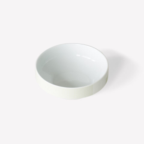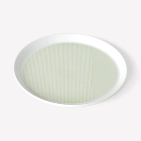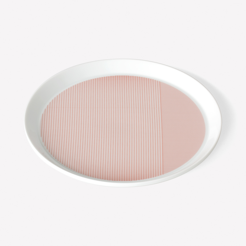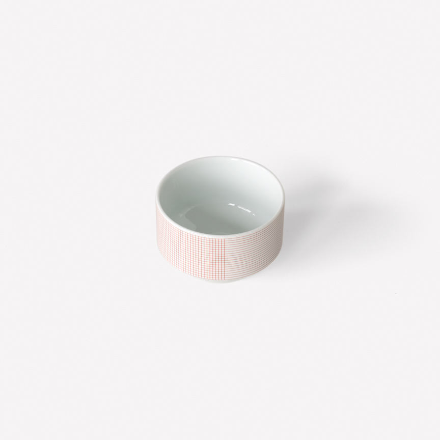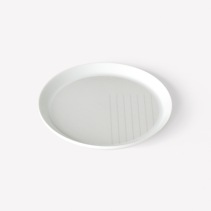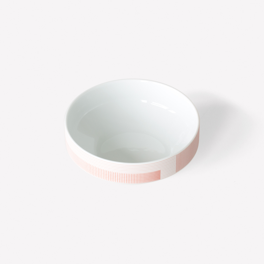 Geometric simplicity characterizes the five-piece set of porcelain tableware—encompassing a small and large plate, bowl, cup, and mug—seen in circular volumes set atop slightly conical bases. Produced by 1616 / arita japan, the porcelain is embellished with a graphic reinterpretation of Grid, a groundbreaking textile created by Scholten & Baijings in 2014 in collaboration with the New York-based Maharam Design Studio. Over the course of the textile’s unusually long repeat—based on the ten yards typically required to upholster a sofa—Grid investigates color densities built up by parallel and perpendicular lines. In Stefan Scholten’s words, “The density of the grid determines how one experiences color and gives the color a more airy appearance than a monochromatic color plane.” Now at a dramatically reduced scale and with inverted color proportions, Grid enlivens the porcelain pieces in three different color schemes applied with varying matte or gloss effects.