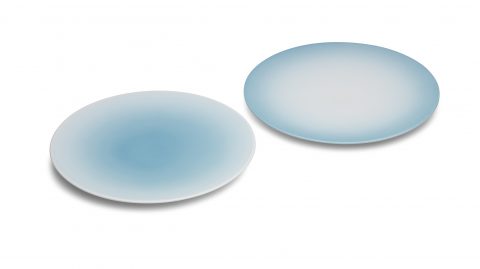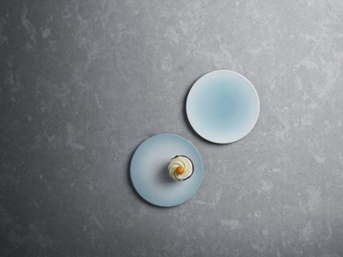 In addition to cups and saucers, the collection comprises plates and platters for cakes, savoury titbits, fruit and delicacies. The porcelain plates have been hand decorated with light-blue colour gradients. This makes every plate unique. There are two variations: one version with gradients from inside to outside, and vice versa. There is a large, matching, high-gloss porcelain cake platter with soft blue colour gradients running from inside to outside. The cake stand, conversely, has a stainless steel foot holding a mat porcelain platter.
