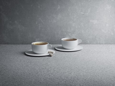 Aside from being tea enthusiasts, Scholten & Baijings are also passionate about high-quality espresso and cappuccino. That’s why in addition to the porcelain cup and saucer they also designed a special double-walled stainless steel espresso cup with accompanying saucer. The saucer features an exclusive detail: an etched line that runs till the centre of the saucer. In the case of the porcelain teacup with saucer, the line has been executed in silver and runs through the centre of the saucer. This is a reference to the original ‘silversmithy’, the workplace of Georg Jensen, renowned for his silver products. By also making use of other materials, such as porcelain and coloured synthetics, and by applying different textures, patterns and colours that are recognizable features of Scholten & Baijings’ signature, ‘Tea with Georg’ forms a perfect family. The pieces also combine attractively with existing services.