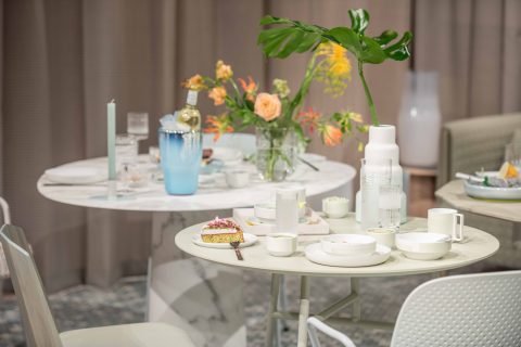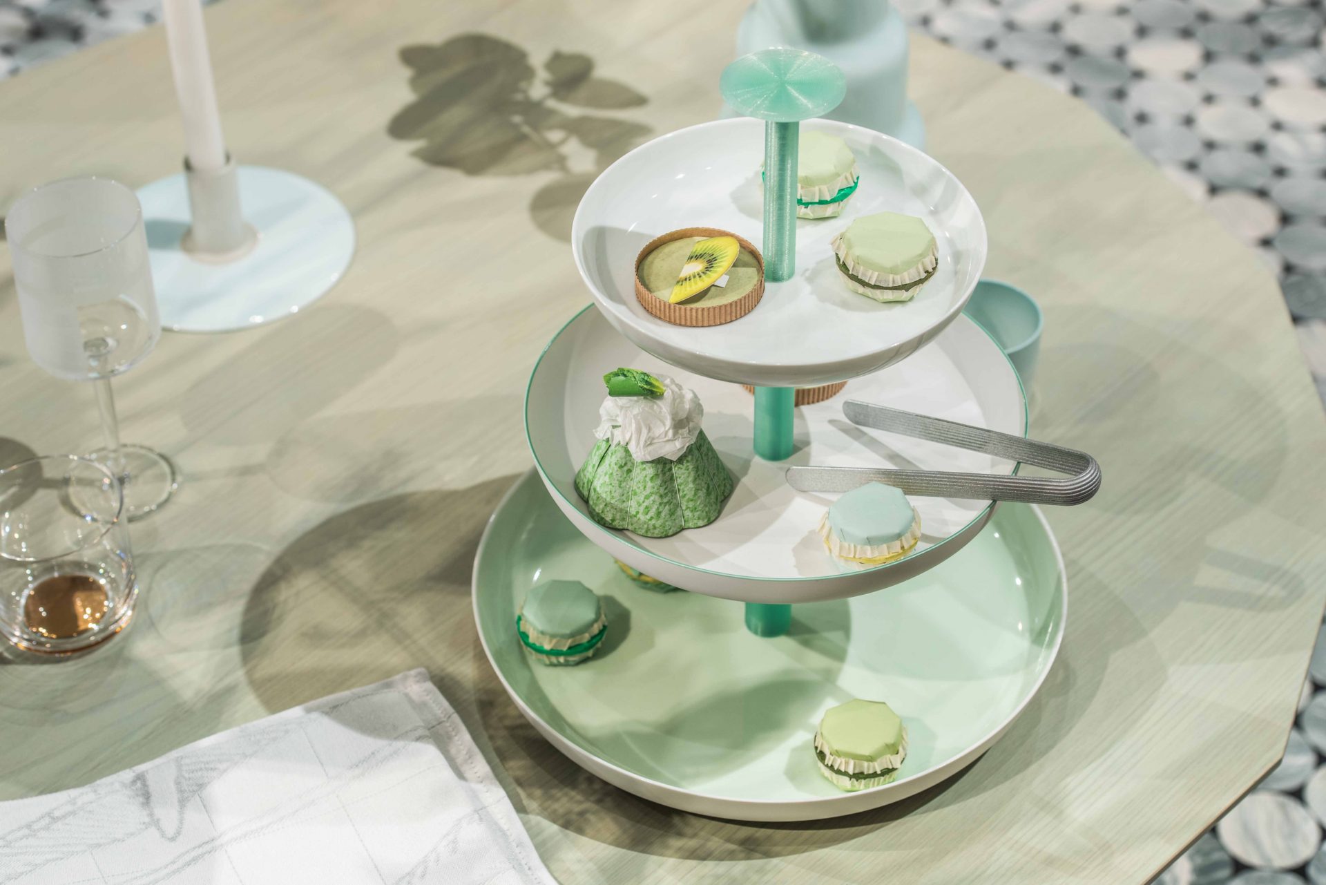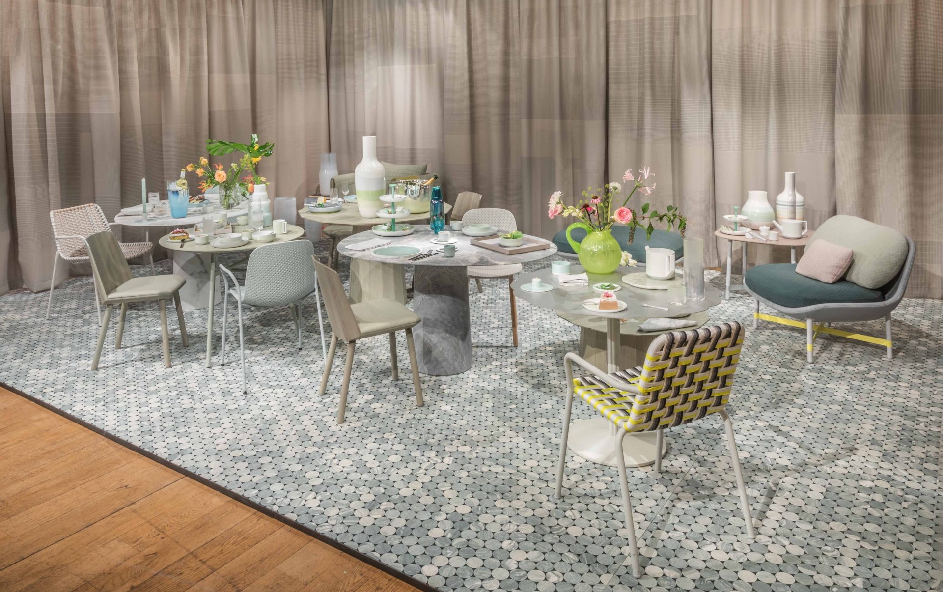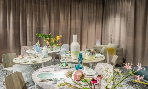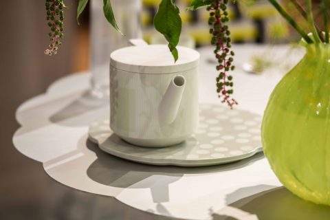 Scholten & Baijings invited visitors to immerse themselves in a daily tea ritual, held throughout the nine days of London Design Festival. Using more than 80 products, the installation delivers a unique take on the ceremony of tea. Fortnum’s iconic Eau de Nil colour provided the inspiration for the installation, with all furniture and products designed by Scholten & Baijings bearing the distinctive green hue. The marble floor and tables have been produced by the Italian marble manufacturer Luce di Carrara. Long green wool Grid curtains have been woven in the United Kingdom for Maharam, and special, green upholstered chairs are furnished by Herman Miller, Moroso and Karimoku New Standard.