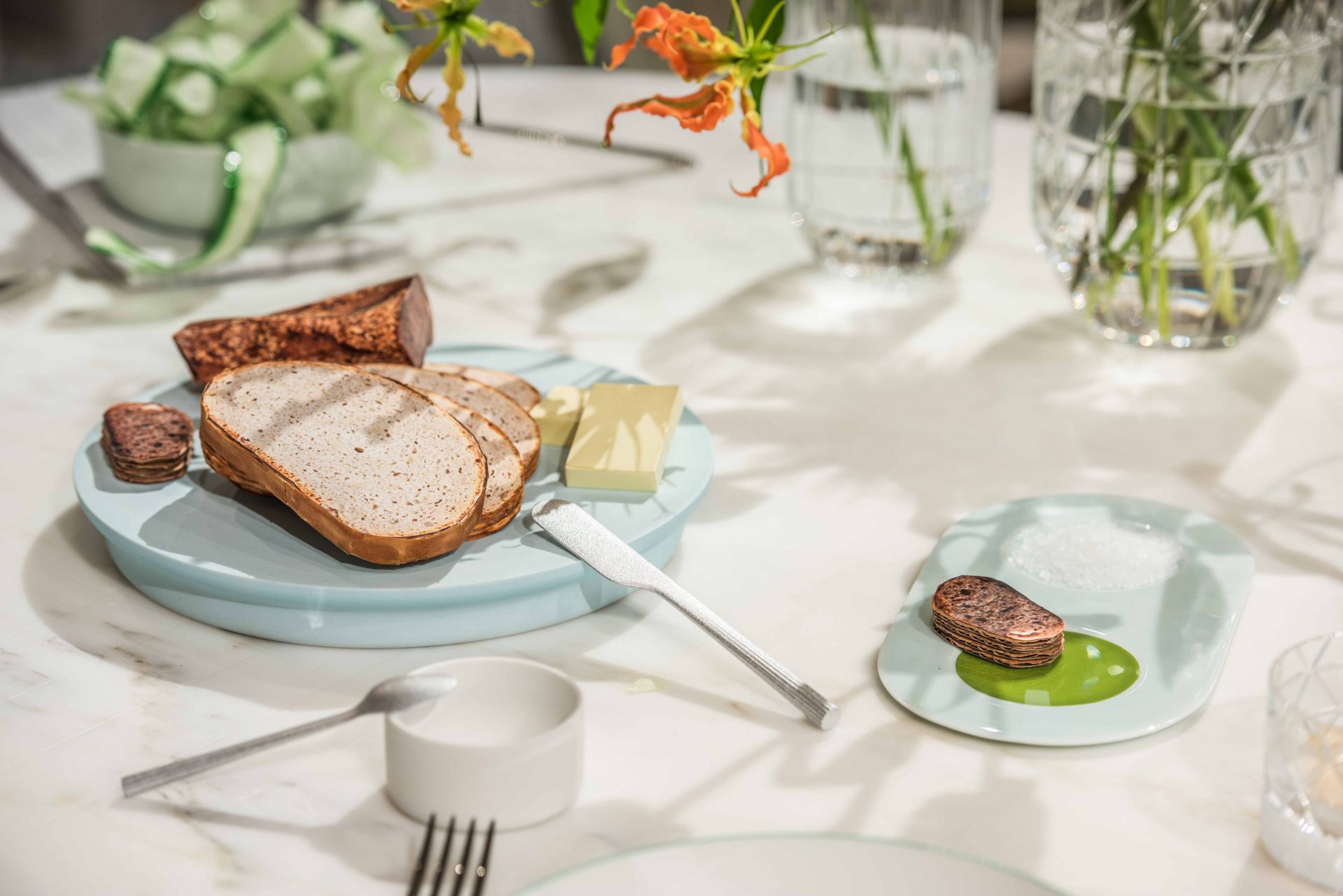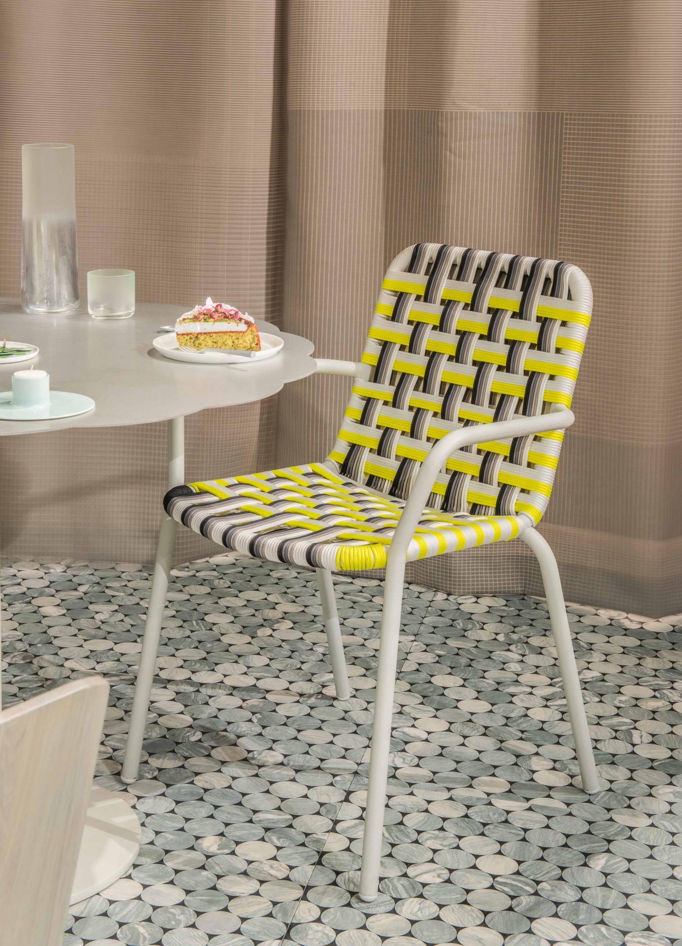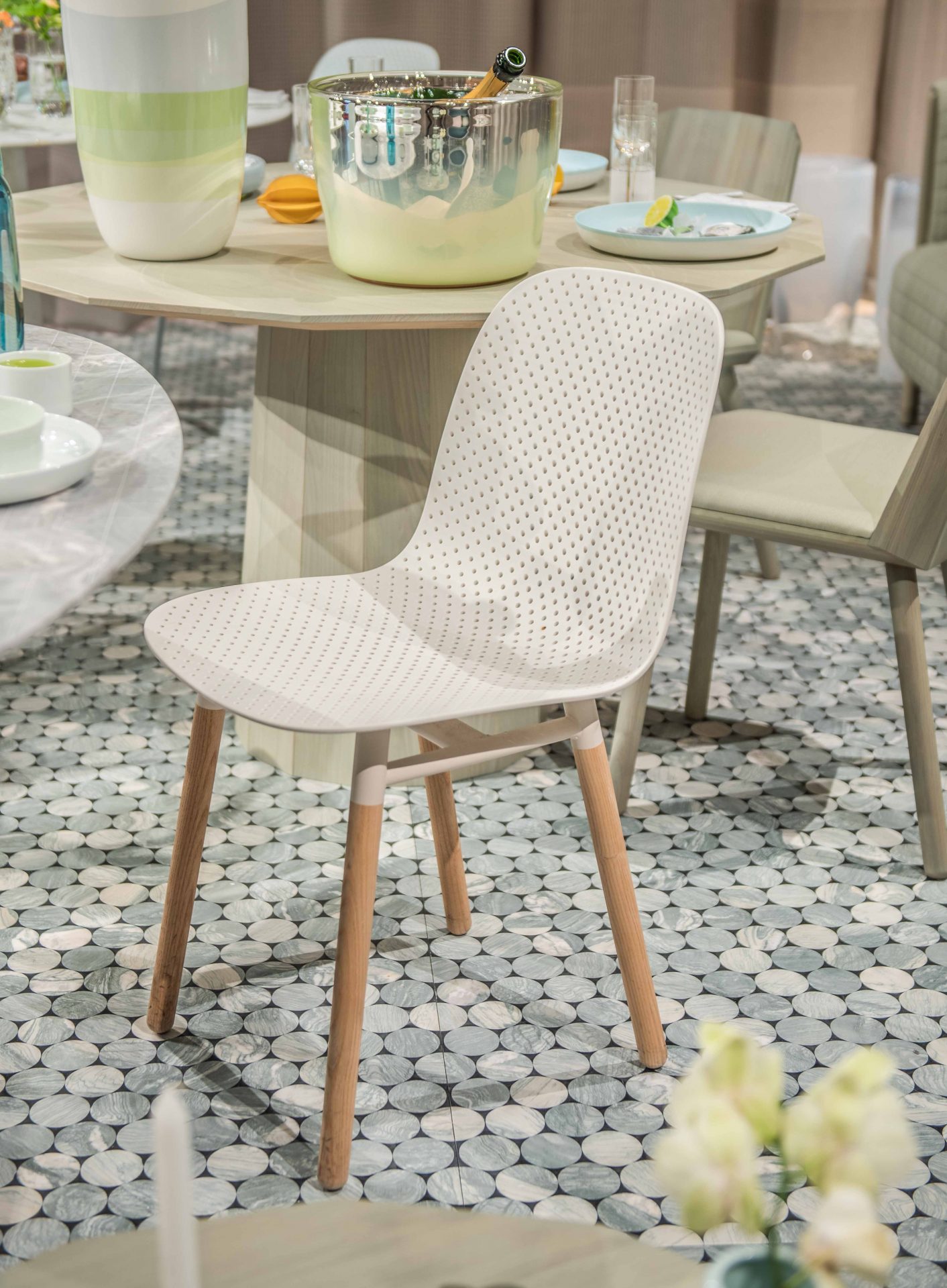 Scholten & Baijings invited visitors to immerse themselves in a daily tea ritual, held throughout the nine days of London Design Festival. Using more than 80 products, the installation delivers a unique take on the ceremony of tea. Fortnum’s iconic Eau de Nil colour provided the inspiration for the installation, with all furniture and products designed by Scholten & Baijings bearing the distinctive green hue. The marble floor and tables have been produced by the Italian marble manufacturer Luce di Carrara. Long green wool Grid curtains have been woven in the United Kingdom for Maharam, and special, green upholstered chairs are furnished by Herman Miller, Moroso and Karimoku New Standard.